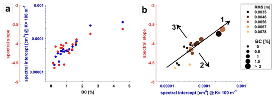 (a) Spectral slopes and intercepts displayed against the benthic coverage. Grain size is constant at 2.6 phi. (b) A slope vs. intercept diagram for the study site. Symbol color denotes RMS roughness, symbol size denotes the benthic coverage in percent. Arrow 1: Effect of increasing high-frequency roughness due to benthic life (this study). Arrow 2: Effect of relative decrease of low-frequency roughness [9]. Arrow 3: Effect of the relative increase of low-frequency roughness [9].