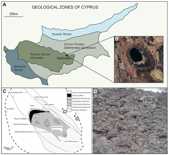 (A) Map of the geological zones of Cyprus. (B) Insert showing sampling locations 07A and 07B. From Google maps. (C) Bedrock map of the Mathiatis mine with sampling locations. (D) Pillow lavas at the Mathiatis mine with sampling point 07B. Geological hammer for scale.