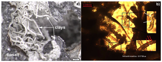 2) The filaments protrude from the montmorillonite film lining the walls of the pore space and both consist of the same clay, thus the film and the filaments are contemporaneous. No secondary mineralization occurs between the vesicle/vein walls and the suggested microfossils, thus the putative microorganisms colonized the rock during the first alteration stage prior to the formation of the vein-filling carbonates. The filaments are totally mineralized by clays and iron oxides formed by circulating hydrothermal fluids (see Section 4.2, Section 4.3 and Section 4.4), and are thus not modern contaminants. Where the filaments are encapsulated by carbonates or zeolites, the secondary mineralization post-dates the growth of the putative microorganisms. Precipitation of secondary minerals and subsequent filling of the voids normally happens 10–20 Ma after formation of the host rock [41]. The ophiolite was emplaced onto land some 20 Ma ago, giving a minimum age of the putative fossils [20] indicating that the microorganisms are syngenetic to early hydrothermal fluids rather than being a modern colonization.