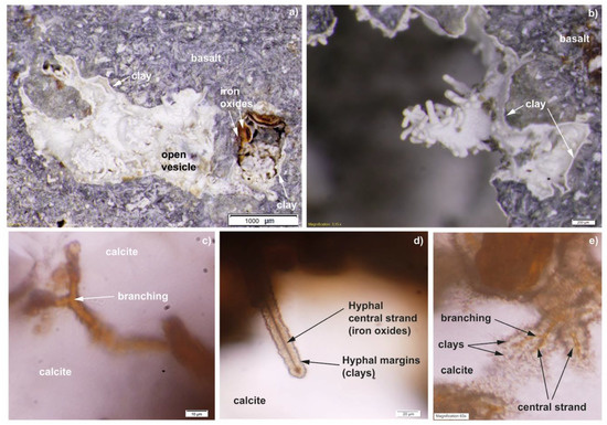 Microphotographs from sample 07A showing: (a) and (b) filaments originating from a clay/iron oxide film lining the interior of the pore space; (c) branching of a filament; (d) hyphal central strand and hyphal margins; (e) branching of the central strand following a general branching of the filaments and mineralizations of clays surrounding the filaments.