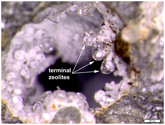 Microphotographs from sample 07A of filaments in open pore space with a terminal precipitation of zeolites forming a swelling at the filament tip.
