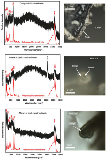 Raman spectra in the spectral range 100–4000 cm−1 of a cavity wall and filament structure in an analcime-filled vesicle in sample 07A. The spectra with peak positions in red numbers show that both the cavity wall and the filaments are composed of a Fe-rich montmorillonite. The spectra from the interior of the filament indicate that hydrocarbons are present with the peak at 3075 cm−1. Reference spectra of montmorillonite after [25] have been incorporated in each spectral diagram. Rutile grains are incorporated in the cavity wall montmorillonite.