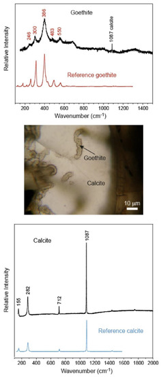 Upper diagram (sample 07A): Raman spectrum in the spectral range 100–1500 cm−1 of the interior of the filament in a calcite-filled vesicle. The spectrum shows peaks that are attributed to goethite. Lower diagram (sample 07A): Raman spectrum in the spectral range 100–2000 cm−1 of a calcite-filled vesicle. Reference spectra of goethite and calcite after Downs (2006) [22] have been incorporated in the figure.