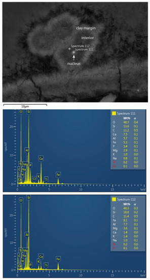 Raman analysis of the film lining the wall interiors, the filament margins and interiors showed discernible peaks at 190, 265, 420 (with one shoulder at 360), 550, 615 and 700 cm−1 together with the strong wide band around 3600 cm−1 (Figure 5). The wavenumbers are close to published data for typical montmorillonite [(Na, Ca)0.33(Al, Mg)2(Si4O10)(OH)2*nH2O] with strong bands near 200, 425 (broad band) and 700 cm−1 with a less intense peak around 270 cm−1 together with a wide band around 3600 cm−1 [24,25]. The peaks at 190, 265, 420 and 700 cm−1 arise from SiO4 tetrahedral unit vibrations. The peak at 550 cm−1 and the downshifted 270 cm-1 peak to 265 cm−1 indicates an Fe-rich composition, the peak at 420 cm−1 is influenced by an Al-rich composition and the peak that occur at the shoulder at 360 cm−1 is an indicator for some Mg [25]. The extra band at 615 cm−1 is usually not found in montmorillonite spectra, but matches the 604 cm−1 peak caused by interference of Fe3+ with Si-O-Si groups in the spectrum of glauconite [(K, Na)(Fe3+, Al, Mg)3(Si, Al)4O10(OH)2] [25]. This extra band may suggest that the Fe-rich nature of the montmorillonite is due to the presence of a glauconite-like structure formed by replacement reactions of the montmorillonite. A mixture of smectite and mica is a common clay association in marine sediments [26] and may also explain why the measured Raman spectra are identified as montmorillonite and not nontronite. Good Raman spectra of clays may be problematic to obtain owing to the ultra-fine texture of the material and low degree of crystallinity [25]. In places, small fragments of rutile appear in the clay (Figure 5). The wide band around 3600 cm−1 is assigned to OH vibrations (Figure 5). The appearance of an additional strong peak at 3075 cm−1 in the filaments interiors compared to the margins suggest the presence of hydrocarbons and bands in the range 3000–3100 cm−1 that can be assigned to C-H stretches in aromatic compounds [27] or =CH2 [28] (Figure 5). The central strand is mineralized by goethite with distinct Raman peaks at 246, 300, 386, 483 and 550 cm−1 in the interior of the structures (Figure 6). The presence of hydrocarbons and goethite in the interiors are displayed by a colour variation in optical microscopy. Filaments with compartments partitioned by repetitive septum-like walls and globular nuclei of 1 or a few µm show a content with a few wt % P according to EDS (Figure 7).