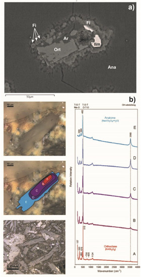 (a) ESEM image from sample 07A of a orthoclase (Ort) and ilmenite (Ilm) crystal with alteration rims (Ar) and associated filaments (Fi) as well as film lining (Fl) the mineral surfaces embedded in an analcime (Ana); (b) Raman spectra in the spectral range 100–4000 cm−1 of an altered orthoclase crystal shown in the uppermost microphotograph and its position in the sample (lowermost microphotograph). The Raman spectra A–E illustrate the transition from the endmember feldspar identified as orthoclase (red spectrum A) to the endmember zeolite identified as analcime (blue spectrum E) with intermediate phases represented by red- to blueviolet spectra B to D. Band positions are indicated by wavenumbers (cm−1) on the red spectrum for orthoclase and on the blue spectrum for analcime. The spectral range for vibrational bands Me-O (Me = K, Na), T-O-T and O-T-O (T = Si, Al), and OH is given on top of the diagram. The spectra in the diagram correspond to the areas marked A–E (with the same color) in the middle microphotograph. These areas represent different zones of the gradual transition from the original orthoclase still left in the core to the final phase analcime along the margin of the crystal.