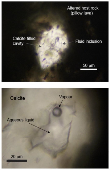 Fluid inclusions are in general rare in the samples but six inclusions in sample 07B with an aqueous liquid and a vapor bubble were distinguished in one specific sample of calcite (Figure 9). Five of these that were found in calcite veinlets, varied in size from 5 to 20 μm and were irregular with angular shapes. Such inclusions may have suffered post-entrapment modifications like stretching or leakage, which can result in a shift to higher homogenization temperatures. The recorded homogenization temperatures from these inclusions, 109 °C to 131 °C (to liquid), should be used with caution and are probably somewhat too high. However, one large fluid inclusion (40 μm) that was found in a cavity filled with well-preserved calcite has survived without leakage. The small size of the cavity and the surrounding basaltic host rock has protected the fluid inclusion from deformation and leakage. Homogenization temperature of this inclusion was measured at 75 °C (to liquid) which is a minimum value for the formation temperature. Initial melting of all six inclusions was observed at temperatures around −35 °C indicating a mixed composition dominated by Mg2+, Fe2+, Ca2+ and Na+ [23]. Final ice melting occurred between −2.4 °C and −2.7 °C, corresponding to salinities from 4.0 to 4.4 eq. mass % NaCl [33].