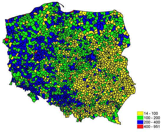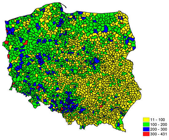 In the following stage, it was checked whether a division of administrative communes (Figure 3) and rural municipalities will enable their better division with regard to the value of the mass waste accumulation indicator.