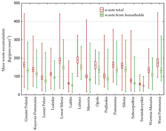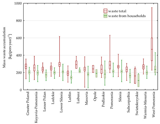 Provisions of the Act of 2013 [28], which imposed on municipalities the duty to organize waste collection from all property owners and social and economic infrastructure units, facilitated determination of the real amount of municipal waste generated on their territories. The size of waste is the most frequently described by the mass waste accumulation indicator expressed in kg∙(per∙year)−1.