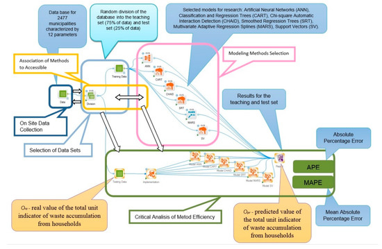 In the first part of construction of the prognostic model of the mass waste accumulation indicator, it was decided to use as input variables indicators suggested by other authors who investigated this phenomenon, i.e., administrative type of a commune, population density, building population rate, percentage of building heated with natural gas, participation of farms which earn income from agricultural activity, and the commune income indicator. Artificial neural networks (ANN), multivariate adaptive regression splines (MARS), classification and regression tree (CART), chi-square automatic interaction detector (CHAID), support regression trees (SRT), and support vectors (SV) available in Statistica® program were used for construction of models in Data Miner working space (Figure 5). Models were built for five randomly selected voivodeships in Poland.
