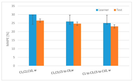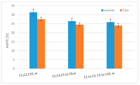 Assessment of the quality of the developed models of the total waste accumulation indicator based on studied set of input variables (C1 to C10). C1—municipality administrative type; C2—functional structure of communes; C3—population density per·km−2; C5—indicator household size per·building−1; C6—average agricultural area ha; C7—percentage of buildings heated with natural gas; C8—participation of farms which earn income from agricultural activity; C9—indicator of the municipality income PLN·per−1; C10—typology of municipalities according to the scope of impact; and w—voivodeship.