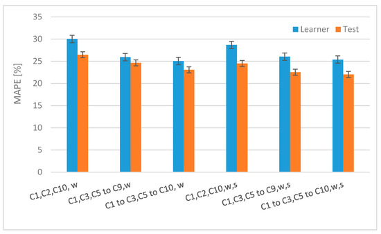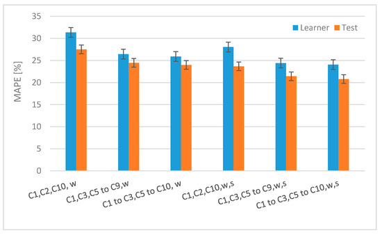 The analyses prove that the best quality models may be obtained with the use of the following input variables: municipality administrative type (C1), population density (C3), building population rate (C4), average agricultural area (C6), percentage of buildings heated with natural gas (C7), participation of households which earn from agricultural activity (C8), commune income indicator (C9), and information on the location of the commune in a particular voivodeship (w). The above-mentioned variables were also supplemented with information on the functional type of a commune and typology of communes (C2, C10), according to the scope of the impact based on the methodology presented in Bański’s paper [31]. Since the tests which were carried out did not unanimously indicate which of the analyzed methods enables the obtainment of the most effective forecasts, the below diagrams (in Figure 6 and Figure 7) present the results for combined predictions which constitute an average value for the results obtained with particular methods.