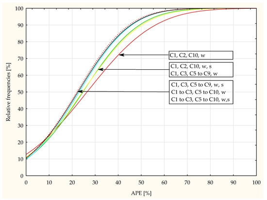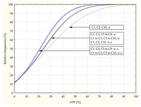 The analysis shows that the construction of separate models for developed clusters which form uniform municipalities groups enabled the increase of the quality of made predictions of the mass waste accumulation indicator (Figure 10 and Figure 11). It is particularly visible for the total waste accumulation indicator for which the level of APE errors with values up to 30% is 53%, respectively, for the set of determined variables (C1, C2, C10, w), 60% for the determined set of input variables (C1, C3, C5 to C9, w), (C1 to C3, C5 to C10, w), and (C1, C2, C10, w, s), and over 70% for the determined set of variables (C1, C3, C5 to C9, w, s) and (C1 to C3, C5 to C10, w, s). Moreover, for majority of cases including the information on belonging of the municipalities to a particular cluster enables reduction of the maximum error values APE to ca. 70%.