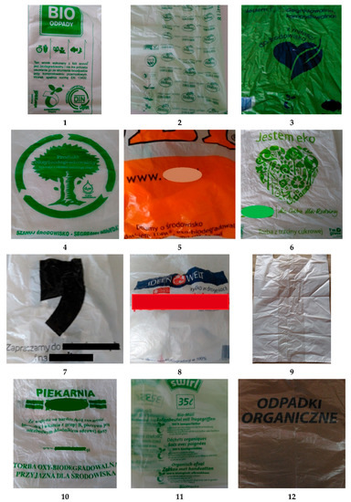 Preliminary tests of selected 10 packages showed that the majority of composted samples of biodegradable and oxo-biodegradable plastics did not decompose or were only partially fragmented [34]. In order to obtain more data for statistical analysis, the number of samples was extended to 12, and three series of experiments on their composting were carried out. Table 1 presents the characteristics prepared on the basis of their own research and information from packaging manufacturers. All of them have been characterised as degradable in the composting process, biodegradable, oxo-biodegradable, or intended for organic waste. Samples of approximate 500 cm2 were cut from shopping bags and waste disposal bags. Figure 1 shows the appearance of the samples before composting (new bags).
