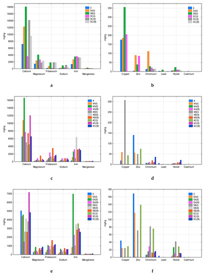 Table 4 presents a comparison between the a and c groups, which showed statistically significant differences between potassium, sodium, iron, manganese, zinc, lead, and cadmium contents. These differences were confirmed by both tests. Furthermore, the nonparametric test showed statistically significant differences between copper and nickel contents. None of the tests showed any differences between the studied groups in the case of calcium, magnesium, and chromium content (as in the previous comparison).