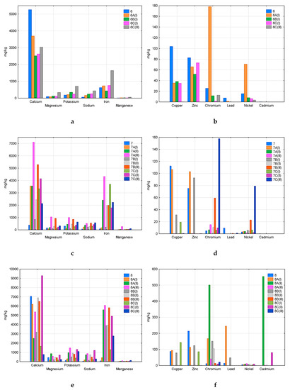 Figure 4. Comparison of the content of analysed metals in new and composted samples 6 (a—macroelements, b—heavy metals), 7 (c—macroelements, d—heavy metals), and 8 (e—macroelements, f—heavy metals).