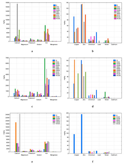 Figure 5. Comparison of the content of analysed metals in new and composted samples 9 (a—macroelements, b—heavy metals), 10 (c—macroelements, d—heavy metals), and 12 (e—macroelements, f—heavy metals).