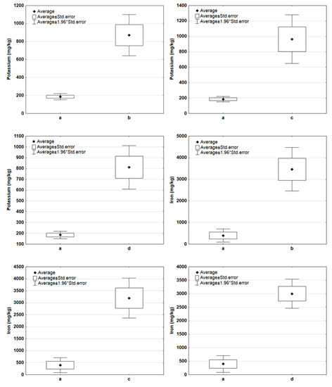 Figure 6 and Figure 7 show descriptive statistics (mean, standard error) for potassium, iron, copper, and zinc content in the compared pairs of groups: a–b, a–c, a–d. In the case of potassium and iron (Figure 6), there is an increase in concentration in composted samples. These components were released to the composted mass of waste only to a small extent. The situation was different in the case of copper and zinc (Figure 7), whose contents in the samples after composting were lower. This could have been due to the release of some of these components into the compost.