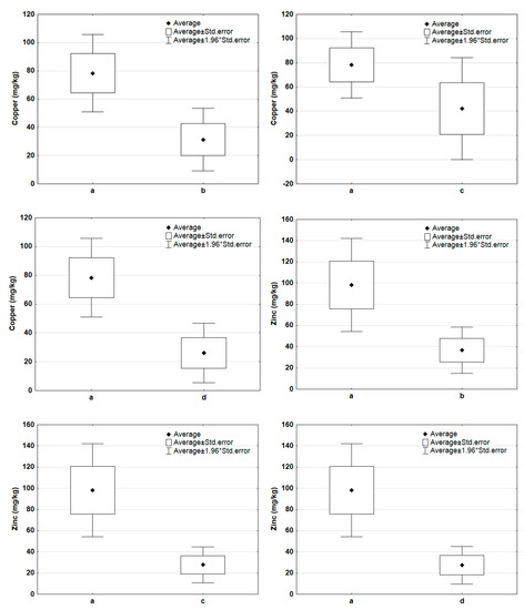 Figure 7. Comparison of basic statistics (mean, standard error) for copper and zinc content in the tested sample groups (a—new samples, b—composted samples without irradiation, c—composted samples irradiated for 20 h, d—composted samples irradiated for 50 h).