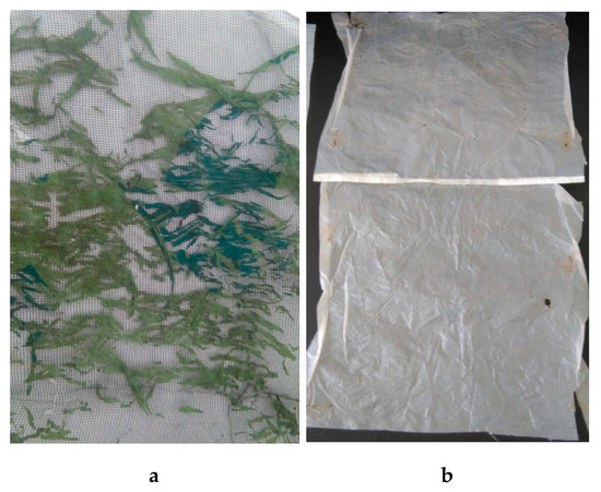 Figure 8. The appearance of the samples after composting: (a) biodegradable plastic from corn and potato starch (Sample 3), (b) oxo-biodegradable plastic (Sample 9) [photo F. Markowicz].