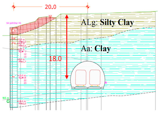 The benchmark of the FEM analyses was a cross-section of the Catania (Italy) underground system actually under construction. The section includes an aboveground building (Figure 1 and Figure 2) [20]. The geotechnical characterization of the soil, performed in two different phases (July 1999 and December 2005–January 2006), shows the soil profile reported in Figure 1 and is characterized by a silty clay (ALg) and a clay (Aa) sub-lithotypes, which belong to the same lithotype, whose Young’s modulus Es0 is constant for the first 10 m at a very small-strain and then increases linearly with depth (in the 300–1700 MPa range) and whose unit weight (γ) is equal to 20 kN/m3. No ground water table is present. Therefore, according to [24], the soil can be classified as type C.