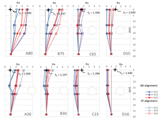 Generally, both amplification and demagnification are possible from the bedrock to the tunnel. Then demagnification across the tunnel often occurs, i.e., the tunnel produces a beneficial effect. Finally, from the tunnel to the foundation level there is always amplification. The beneficial effect of the tunnel is due to the absence of material inside the tunnel. In turn, the tunnel changes the path of seismic waves. Due to probable resonance (as it will be shown in the following Section 4.2.1, the A80 and B75 cases had a strong amplification from the bedrock to the foundation level especially for the E18 and E26 inputs; the A36 case showed lower Ra due to the greater values of D; the B30 case showed lower Ra values in comparison to previous cases, far from possible resonance conditions. For the same reasons, in the remaining cases, the inputs were generally de-amplified. Moreover DSSI (Dynamic Soil-Structure Interaction - continuous lines) caused a reduction of Ra with respect to the free-field condition (dashed lines). Softer soils tended to de-amplify the seismic signal that reached the foundation level; on the contrary, stiffer soils tended to amplify it; this apparently unusual result depended on the high soil damping D for softer soils, whose effects were greater than those of G. In regards to the comparison with SS, the [24] underestimated the amplification at the foundation level for stiffer soils (A80-A36 and B75-B30) and then overestimated it for softer soils (C65-C23 and D55-D16). These results clearly show the importance of an accurate soil characterization for detecting the appropriate “real” design inputs on structures.