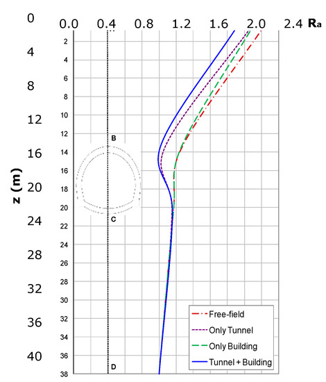 Below point C, i.e., below the tunnel, all the configurations (free-field; only tunnel, only building, and tunnel + building) led to the same Ra vs. z trend.