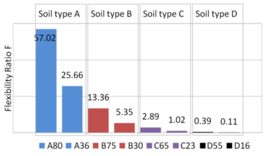 Figure 5 shows the flexibility ratio F for the eight cases studied: for soil types A, B, and C (models “A80-A36-B75-B30-C65”) the tunnel behaved flexibly (F > 1); for soil type C with G = 23% Gmax (model “C23”) the flexibility of the tunnel coincided with that of the soil (F ≈ 1), instead for soil types D (models “D55-D16”) the tunnel was more rigid than the soil (F < 1).