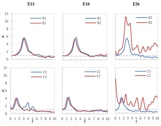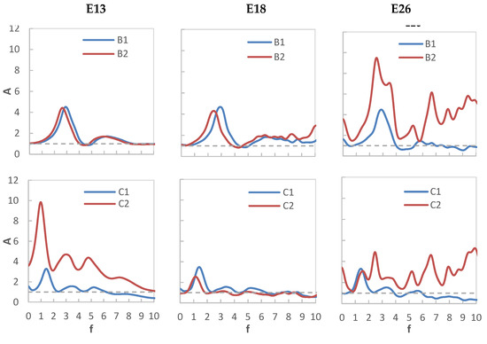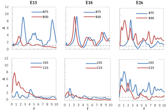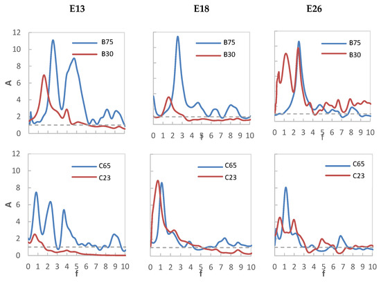 The influence of the nonlinearity of the soil behavior resulted in a shift of the amplification peaks towards lower frequencies due to the reduction of the shear modulus. Furthermore, the nonlinearity effect tended to determine attenuation phenomena at high frequencies [41]. This is clearly visible above all for the inputs E13 and E18: passing from a maximum value of 0.1 g (B75 and C65 cases, blue lines), to one of 0.3 g (B30 and C23 cases, red lines), a reduction in the fundamental frequencies is observable.