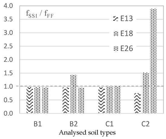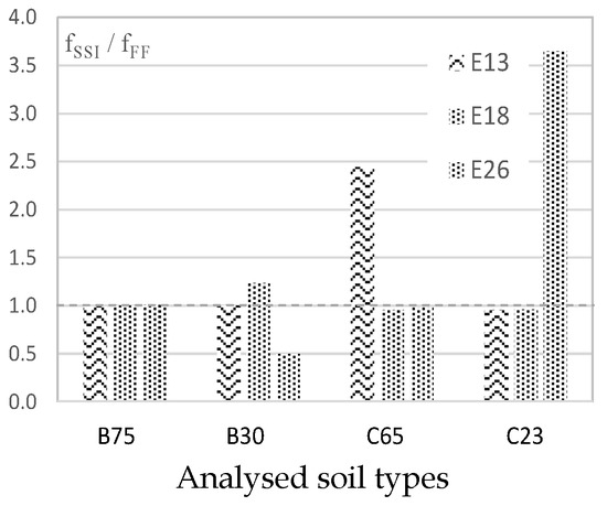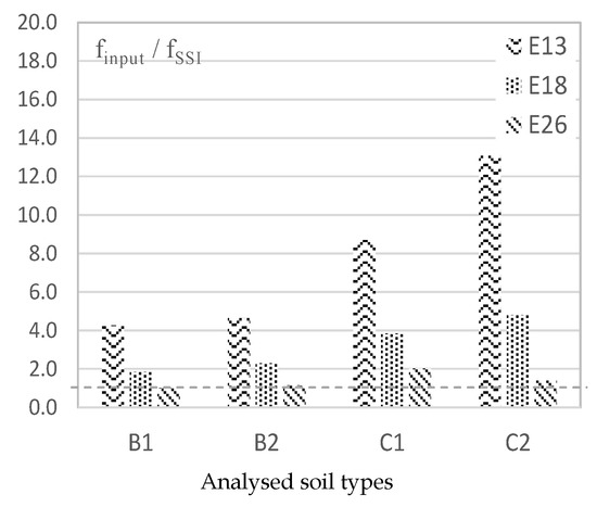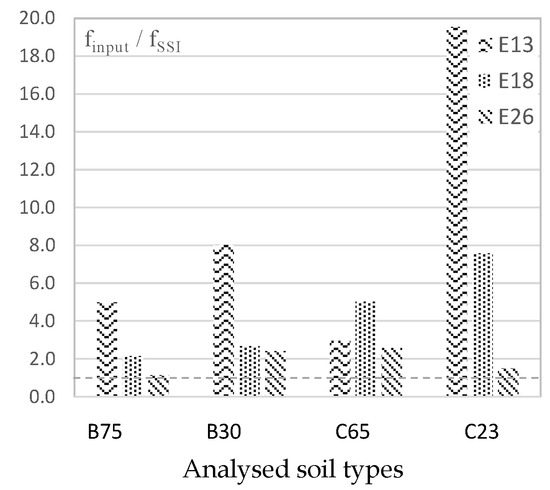 In order to evaluate a possible resonance phenomenon between the seismic input and the soil, the frequencies of the soil column that was investigated below the structure were compared with the fundamental frequencies of the three seismic events, evaluating the finput/fSSI ratio (Figure 9). For the E13 accelerogram, and especially in cases where the accelerograms were scaled to 0.3 g (B30 and C23 cases), high values of the finput/fSSI ratios were obtained, for two reasons: the high frequencies of this input and the low fundamental frequencies for which peaks occur. For the E18 accelerogram, the finput/fSSI ratios were not high but however they were greater than unity. For the E26 accelerogram, the finput/fSSI ratios were near unity and therefore resonance phenomena occurred.