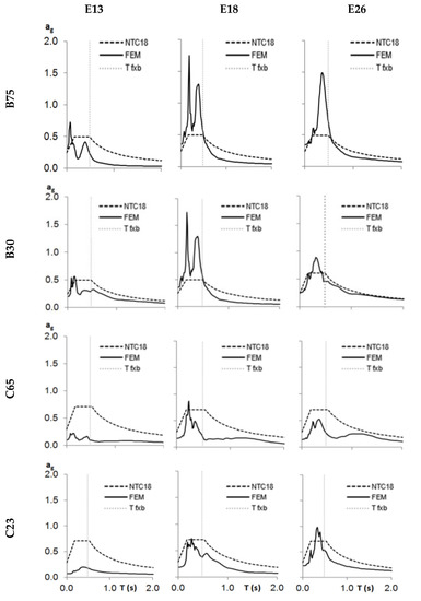 For the first set of spectra, corresponding to accelerograms scaled to 0.1 g and applied to soil type B (B75 case), the spectrum provided by [24] was detrimental for the inputs E18 and E26. However, the spectral accelerations in correspondence to Tfxb = 0.484 s, for all the three accelerograms E13, E18, and E26 (respectively equal to 0.26 g, 0.54 g, and 0.59 g) were not far from that foreseen by the [24] (0.50 g).