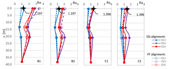 Finally, in order to evaluate the influence of the structure on the fundamental frequencies of the soil deposit, the fSSI/fFF ratios were calculated and are shown in Figure 10. The frequencies in the two alignments did not differ substantially, so the influence of the structure was generally minimal, confirming what was previously deduced by the trend of the amplification ratio with depth.