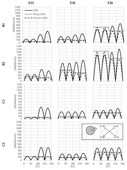 It is possible to assert that there was always a good agreement between the numerical and the analytical bending moments for the upper arc (0° < θ < 180°), instead for the inferior arc (180° < θ < 360°) the numerical bending moments were greater than the analytical ones. Moreover, due to the probable resonant phenomena, the E18 and E26 inputs caused high bending moments for the cases characterized by a flexible tunnel surrounded by soil types B (see Figure 6). The bending moments increased when the qualities of the soil decreased; this was due to the flexibility ratio F that tended to decrease.