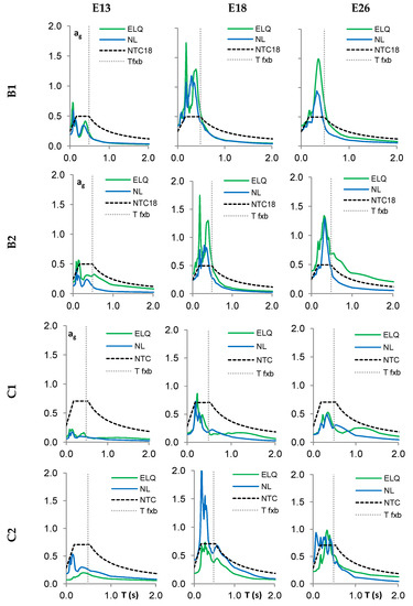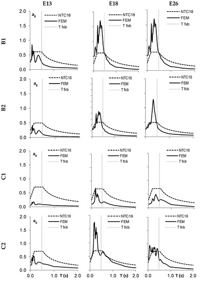 For the second set of spectra, corresponding to accelerograms scaled to 0.3 g and applied to soil type B (B2 case), the spectrum provided by [24] well represented the spectral accelerations for the input E18 and E26, and it was slightly detrimental for the input E13.