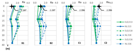 As for the amplification ratios (Figure 19), the comparison between the two constitutive models shows that the Ra trend was almost the same in both the analyses. In particular, in the case of accelerograms scaled to 0.10 g (B1 and C1 cases), slightly higher amplification ratios were achieved by the equivalent linear analyses. Instead, in the case of accelerograms scaled to 0.30 g (B2 and C2 cases), the maximum values were obtained by the nonlinear analysis. The differences due to the two constitutive models were however minimal and this makes it possible to affirm that the same soil filter effect was achieved by both models. Moreover, it can be affirmed that, for relatively low accelerations, using a non-linear constitutive model for the soil is not a recommended solution, because it requires a higher computational cost, but leads, substantially, to very similar results to those obtainable through an equivalent linear elastic modeling, as suggested by [24].