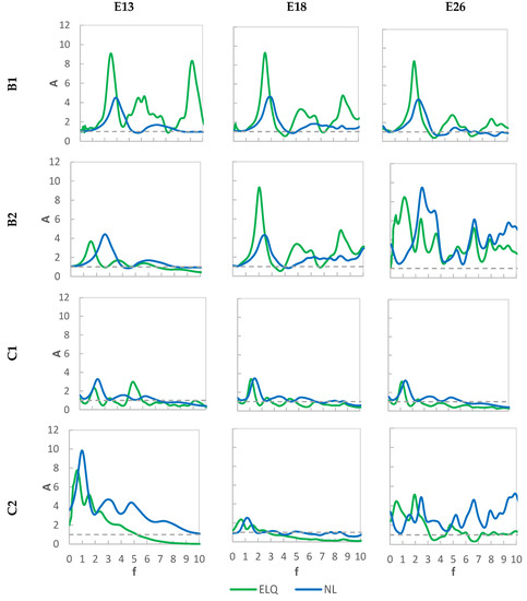 The following figures show the comparison between the results obtained using the two different constitutive models with regards to the amplification ratio (Figure 19) and the amplification function (Figure 20) for the SS alignment. The green lines refer to the equivalent visco-linear elastic model-labeled ELQ, while the blue lines refer to the nonlinear model-labeled NL. Similar considerations can be made for the FF alignment.