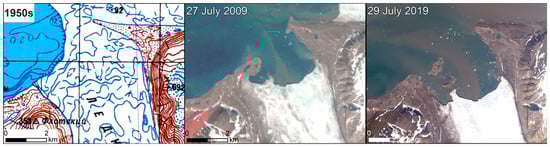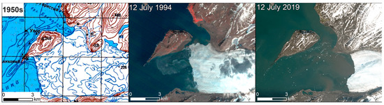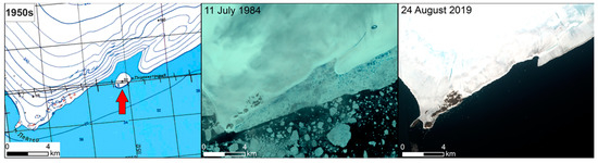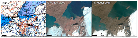 The former Northbrook Island became divided into two parts due to the recession of glaciers which had filled the bedrock depression (in the north-south direction) in the west. According to RIA Novosti (2012) [20], the new strait and island, taking the westernmost part of former Northbrook Island, were discovered by an expedition of the Russian Navy in the summer 2012 and given a navy officer’s name. This island’s origin was not illustrated by any published map or picture. Hence, we made such a figure using, among other data, a Landsat image from 2006, which showed the new strait and island which occupies 18 km2 [5,8] of surface area, at least 6 years before their discovery. However, afterwards, Landsat 4-5 MSS images from 1986 were found, which serve a proof that the new strait and island appeared 26 years before the discovery of this fact (Figure 4). The said strait formed due to recession of glaciers which had filled a depression in bedrock from both the east and west. It is certain that no shelf glacier existed there in the Little Ice Age and 20th century because the said glaciers were significantly declined and fissured, unlike in the case of shelf glaciers or land fastened multiannual sea ice which would have to be flat. Apart from that, the study area had been relatively often and extensively explored. However, it is quite strange that the new strait was not discovered by international summer expeditions in 1990–1992 [21]. This may have been caused by bad weather and/or sea ice between the two glacial coastlines of the strait; the least probable was a frontal re-advance of the glaciers which re-filled the strait’s depression for such a short period then. However, in the 1950s, the glaciers have a clearly smaller extent on both sides of the strait. Since 1986, the new strait between the two studied islands has been partly filled in with marine deposits and thus narrowed (Figure 4).