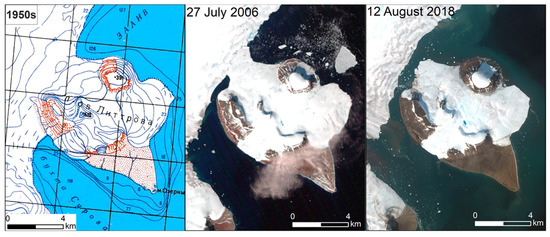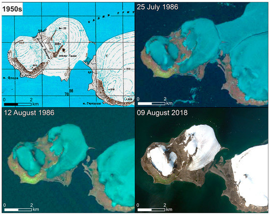 The former Mesyatsev Headland—the northwesternmost part of Eva-Liv Island which is the northeasternmost part of the Franz Josef Land archipelago—was transformed into a small new island [8,18] after the formation of a new strait due to the recession of two ice sheets in the west of Eva-Liv Island. This must have happened before August 2nd, 1985. On this day, the land area below 300 m a.s.l.—i.e., both ice sheets in the west and the majority of the main eastern ice sheet (apart from its top)—remained free of snow. It is interesting that the surface of the new island decreased severalfold from 1985 to 2018 (Figure 2). In the case of further climate warming, the process of the island’s decline will continue and the island will disappear in the nearest future if its bedrock becomes situated below sea level.
