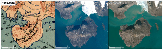 The only new island, apart from islets, on the Spitsbergen coast (the biggest island of the Svalbard archipelago), occupying 16.3 km2 of surface area (Table 1), became transformed from the former Bloomstrandhalvøya peninsula in Kongsfjorden, as result of a decrease in the thickness of the Blomstrandbreen glacier [5]. Ablation of the ice surface of the glacier’s tongue led to is decline in the area of the depression of bedrock, which became a new strait in 1991–1994. In 1995, one of the authors sailed through this strait by boat. As we can see, three new islets (not included in Table 1), appeared in the strait—two of them before the 1990s and the third afterward. Before the glacier’s recession, the islets consisted of rock hills stretching from the bedrock depression above sea level (Figure 9). The pattern of formation of these islets is the same as in the case of the aforementioned former peninsula with the Upor Headland (in Novaya Zemlya) because it certain that its area had not been covered with glacier during the Little Ice Age. This is evidenced at a map from 1909–1910 [15].