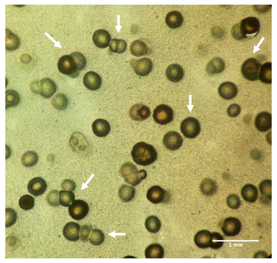 A digital image acquired through an iPhone (used as the camera) of an inoculated B4 agar plate, observed upside down at optical microscope (Leitz-Biomed, 10×). Note globular CaCO3 crystals of different dimensions and their aggregates precipitated by the strain P1 (arrows), after 30 days of growth at 28 °C.