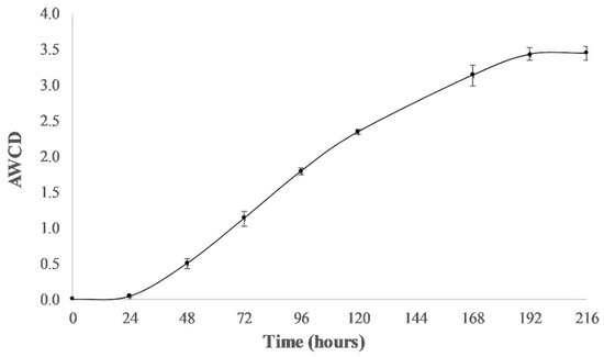 Dynamic of the average well color development (AWCD) of the rhizospheric-soil sample during the incubation time (9 days), at 28 °C (AWCD points are means of three replicates). Data were corrected subtracting the initial readings (at 590 nm) at time zero, as well as the reading of the control well (inoculated but without a C-substrate). The curve shows how the microbial community had a long lag-time in the development of formazan products within the Biolog-plate wells. Development was consistent and linear over the entire incubation period (9 days). The number of positive wells increased slowly for the first 24 h and then increased up to 192 h of incubation, when stationary phase began.