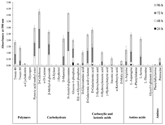 Stacked columns showed the diversification over time of the substrate use from the different groups (polymers, carbohydrates, carboxylic and ketonic acids, amino acids and amines) by the soil microbial community. In the figure, absorbances are reported (recorded at 590 nm) for each substrate from 0 to 48 h (from 72 to 96 h, and from 96 to 216 h. The chart shows how the substrate use in the first 24 h (during the lag-phase, Figure 2), is limited to Glucose-1-phosphate, L-Asparagine, and D-Galacturonic acid. During the exponential phase, an increasing number of substrates (belonging to all five groups) was used by the microbial community.