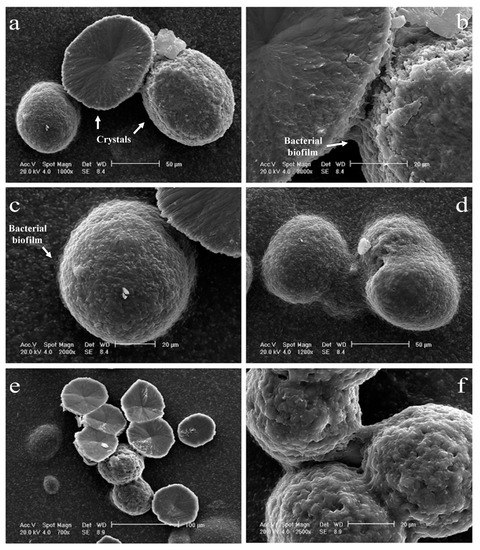- Rodriguez-Navarro, C.; Jimenez-Lopez, C.; Rodriguez-Navarro, A.; Gonzalez-Muñoz, M.T.; Rodriguez-Gallego, M. Complex biomineralized vaterite structures encapsulating bacterial cells. Geochim. Cosmochim. Acta 2007, 71, 1197–1213. [Google Scholar] [CrossRef]