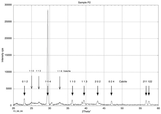 X-ray diffraction pattern from an agar dried culture of strain P2, Vibrio tubiashii. The spectrum shows the presence of a mixture of calcite and vaterite. The background level is due to the presence of the agar and of the adhesive tape.