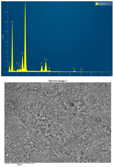 According to EDS analysis, also the untreated sand presents, besides a high content of silica and oxygen, calcium and carbon but in low amount (Figure 11). As showed by the physico–chemical analyses (Table 2) and XRD (Figure 12), organic matter is the origin of C, while lithogenic carbonates could be the origin of Ca identified by EDS.