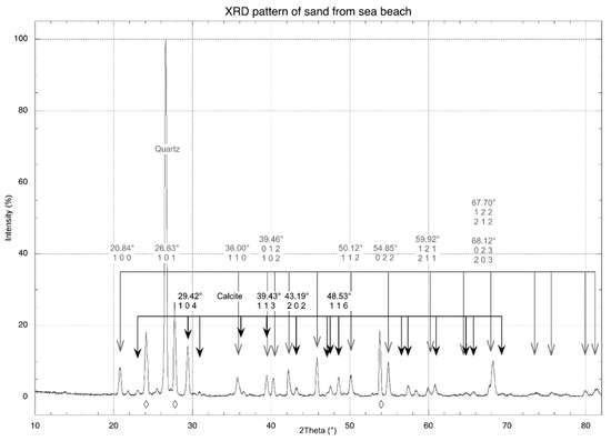 XRD pattern of the sea sand. The spectrum shows the prevalence of quartz and calcite.