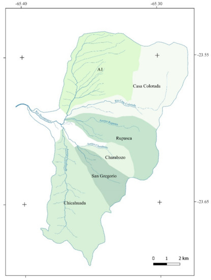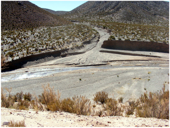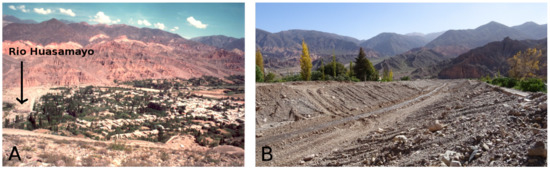 The main morphogenetic process affecting the Quebrada de Humahuaca is the physical weathering which, associated with a strong fracturing of the outcropping rocks, produces an intense erosion of the slopes [28], generating great volumes of unconsolidated material. The concentrated runoff, the gravitational processes and the mass removal (due to frequent and widespread debris flows) cause the over-flooding of the valley floors and the riverbeds aggradation. The consequence of this systematic aggradation is the generation of superelevated riverbeds which, during the rainy season, increase the flooding hazard of the areas close to the streams.