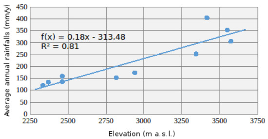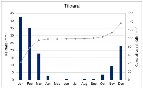 The average annual temperature in Tilcara is 13 °C, with a maximum of 17.1 °C in January and a minimum of 7.1 °C in July [30]. However, the daily thermal excursion is very high. Braun Wilke [31] determined a temperature gradient for the whole Quebrada which decreases approximately 0.55 °C every 100 m of altitude. The rainfalls regime recorded in the Tilcara gauge (Figure 3), recorded in the period 1934–1990, shows a dry winter and a rainy summer. The average annual precipitation is 136 mm, as a consequence of the orographic precipitations that are generated with the arrival of the Atlantic anticyclone.