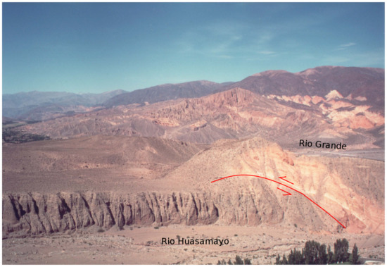 Figure 6 (from Cencetti [28]) shows a medium-scale geological map of the central portion of the Quebrada de Humahuaca, more specifically the subject of this note.