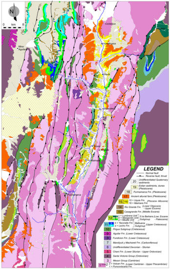 The most ancient outcropping formation is the Formación Puncoviscana, of Precambrian age [33,34,35,36]; it is a very thick formation, about 1500 m, weakly metamorphosed and made up of shales, phyllites, greywackes and quartzites. Conglomerates and sandstones of continental environment, in river facies, belonging to the Units of the Grupo Mesón of the Cambrian [33] and conglomerates, sandstones and clays in continental shelf facies, belonging to the Units of the Grupo Santa Victoria of the Ordovician [33,37,38,39] overlap with angular unconformity.