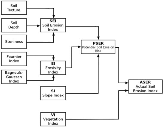 - PSER (Potential Soil Erosion Risk) which indicates the susceptibility of soils to erosion, considering the factors linked to land use, climatic and topographic conditions;